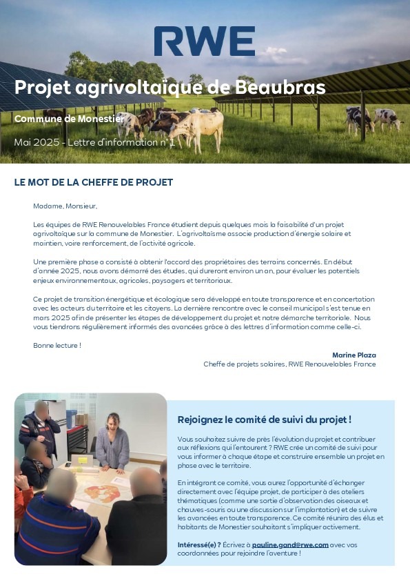 Tout au long du développement du projet, des lettres d’information sont distribuées aux habitants, afin d’exposer l’actualité du projet photovoltaïque : enjeux et avancées des études, calendrier, etc.